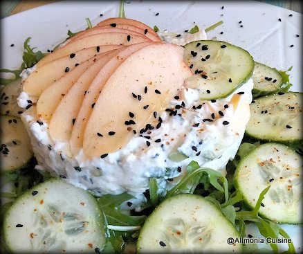 - Mélanger les dés de pomme et de concombre, les herbes et les graines de nigelle à la crème de feta.